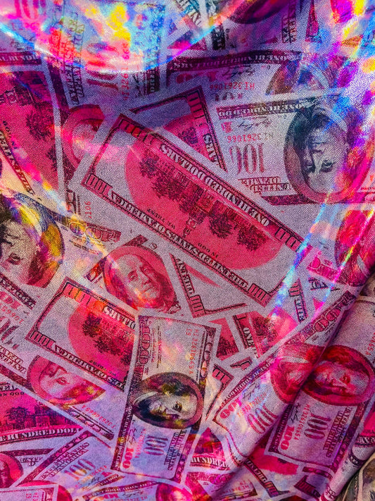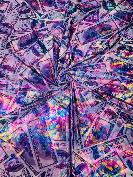 New 100dlls Bill Money design Iridescent hologram purple metallic nylon spandex 4-way stretch 58/60”