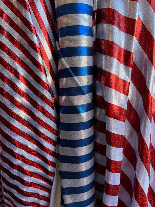 Metallic mystique fabric STARS & STRIPES design with foggy foil 4way nylon spandex 58/60" sold by the yd. Ships worldwide from Los Angeles