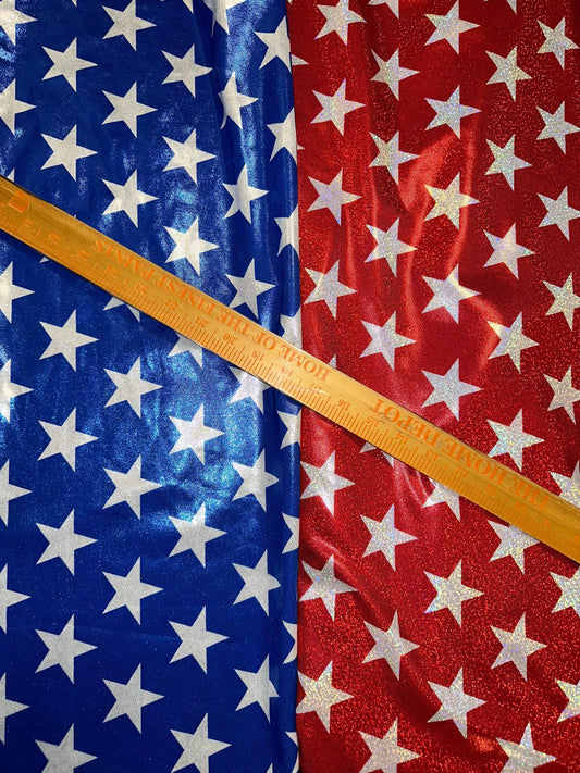 Stars freedom design pint on hologram nylon spandex 4-way stretch 58/60” Sold by the YD.
