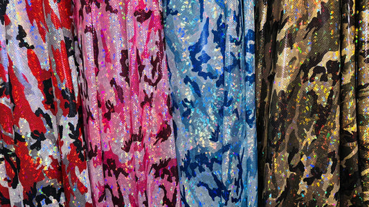Deluxe Camouflage design on shattered glass metallic nylon spandex 4-way stretch 58/60” High quality fabrics by AlexLAFabrics