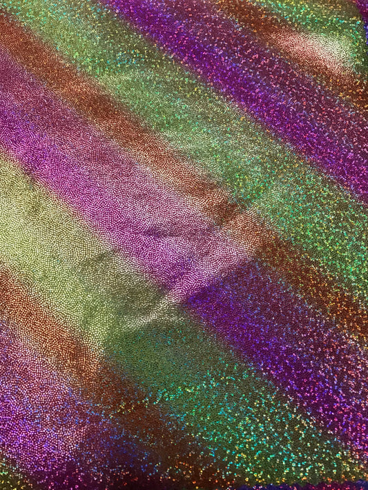 Rainbow hologram foggy foil 4way nylon spandex 58/60" Sold by the YD. From Los Angeles California USA.
