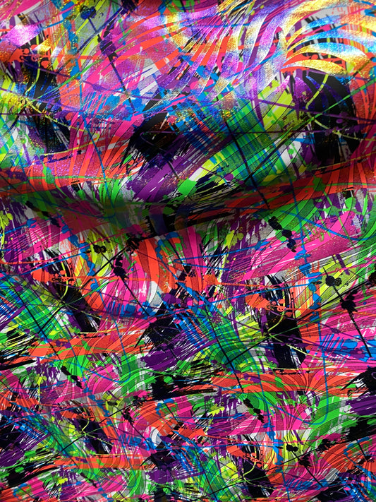 Graffiti Paint design print on nylon spandex with foggy foil 4-way stretch 58/60”