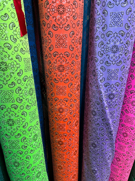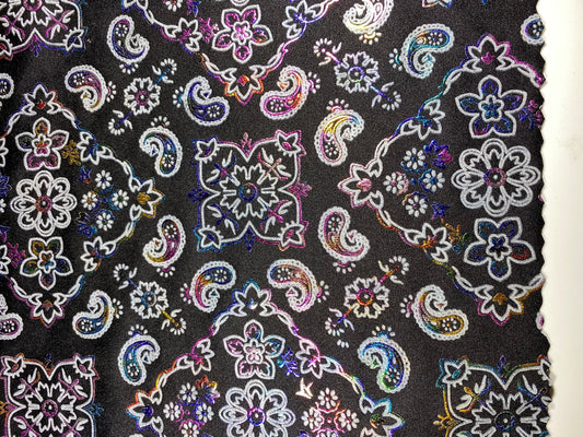 New Bandanna paisley design black/rainbow metallic nylon spandex 4-way stretch 58/60” Sold by the YD. Ships Worldwide from Los Angeles cali