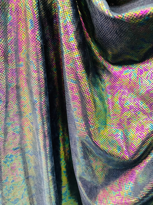 Cobra design iridescent stretch velvet with hologram foil Black/Iridescent 4-way 58/60” Sold by the YD. Ships Worldwide from Los Angeles CA
