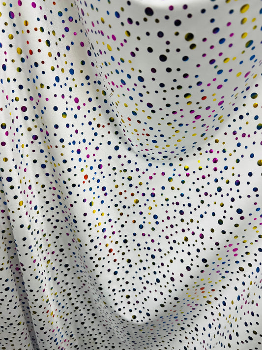 Metallic polka dots design white/multicolor hologram nylon spandex 4-way stretch 58/60” Sold by the YD. Ships Worldwide from Los Angeles CA