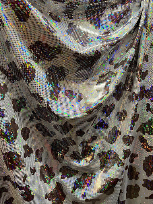 Cow design w/silver/Black & w/silver/brown on shattered glass New metallic hologram nylon spandex 4-way stretch 58/60” Sold by the YD.