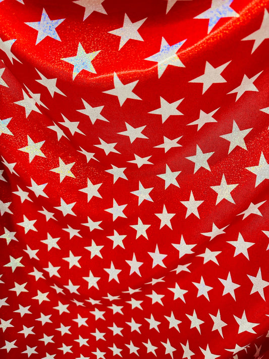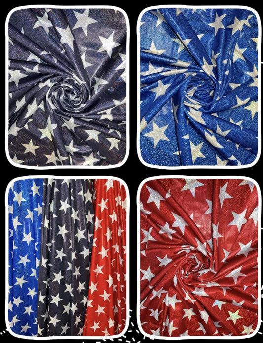 Stars freedom design metallic hologram nylon spandex 4-way stretch 58/60” Multicolor Sold by the YD.