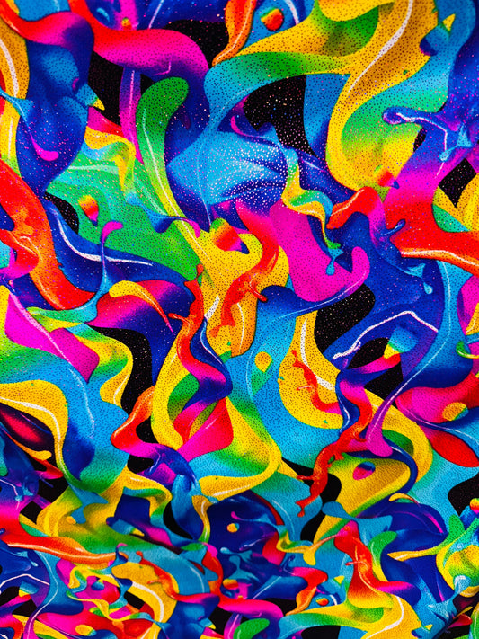 New splatter paint zebra design multicolor metallic nylon spandex 4-way stretch 58/60” Sold by the YD. Ships worldwide from L.A CA USA.