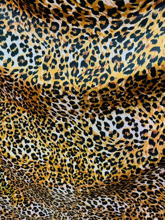 New Exotic Leopard design hologram metallic nylon spandex with foggy foil 4-way stretch 58/60”