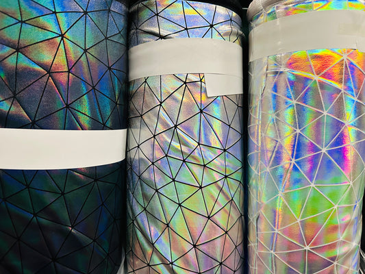 Triangle design hologram metallic nylon spandex 4-way stretch 58/60” Sold by the YD. Ships Worldwide from Los Angeles California USA.