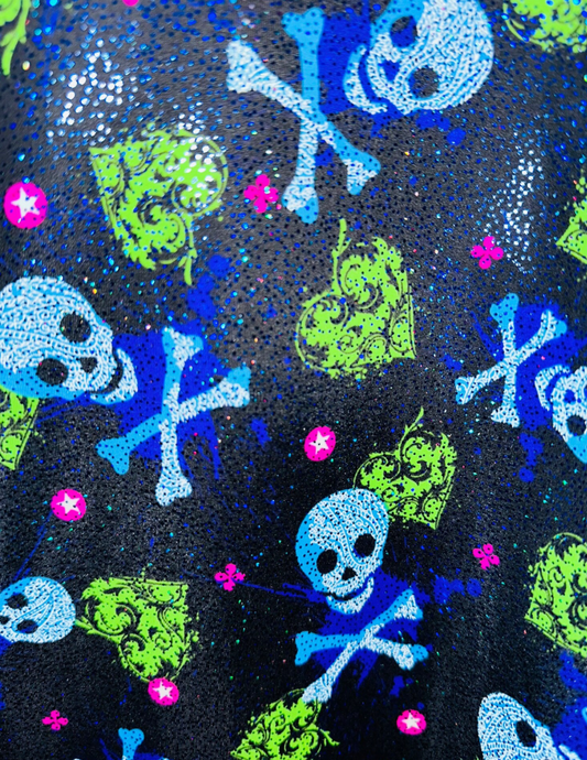 Luxury Skulls with Hearts design print on best quality of nylon spandex with foggy foil 4-way stretch 58/60”