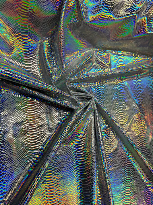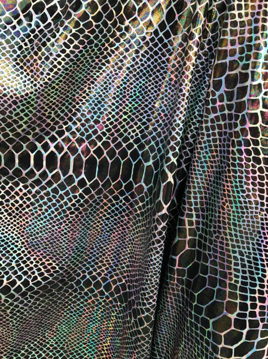 Iridescent snake skin cobra design hologram metallic nylon spandex 4-way stretch 58/60” Sold by the YD.