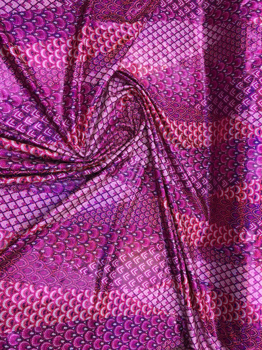 Geometric design hologram metallic tie dye nylon spandex 4 way stretch 58/60" Sold by the YD. Ships worldwide from Los Angeles California U