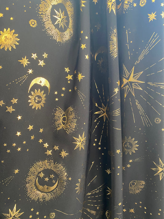 New celestial multi stars design metallic poly spandex 4-way stretch medium weight 58/60” Sold by the YD. Ships Worldwide from Los Angeles