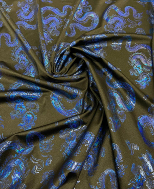 New Dragon design print on metallic nylon spandex Black Royal 4-way stretch spandex 58/60” Sold by the YD. Ships worldwide