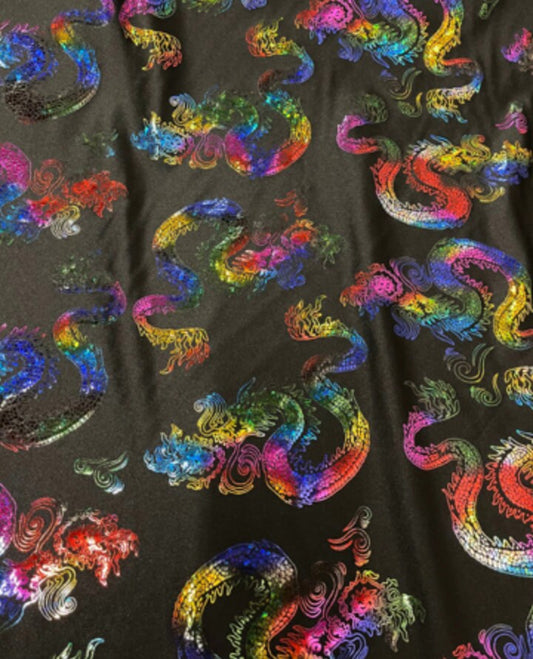 New Dragon design print on metallic nylon spandex Black Iridescent rainbow 4-way stretch spandex 58/60” Sold by the YD. Ships worldwide