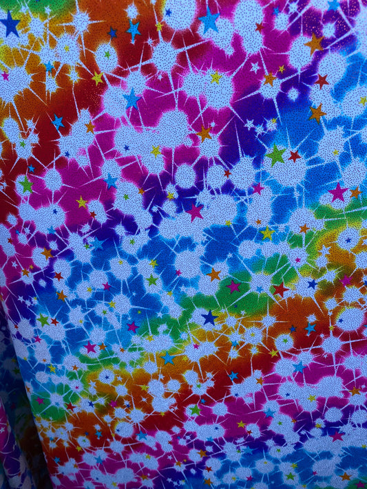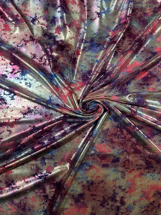 Tie dye splattered design metallic nylon spandex with foil 4-way stretch 58/60” Sold by the YD. Ships worldwide from Los Angeles California