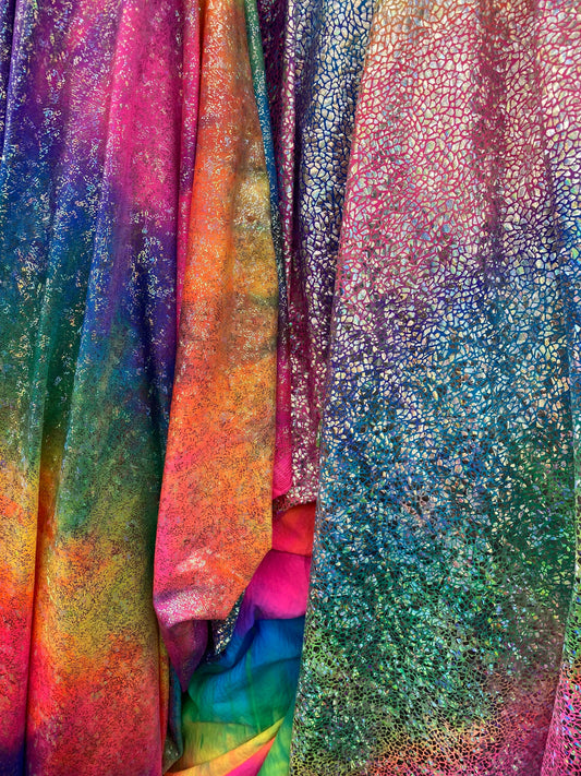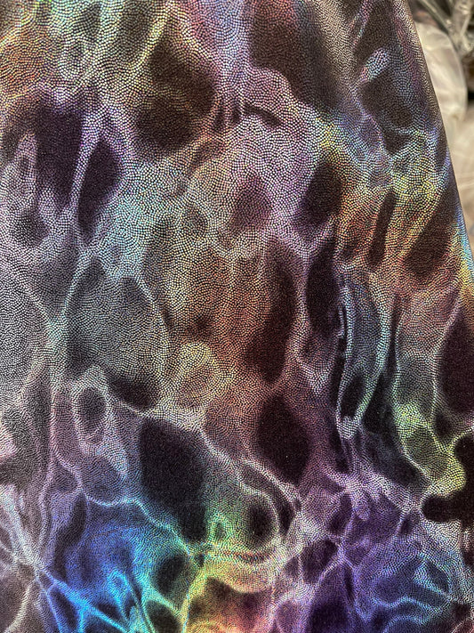 New Rainbow hologram metallic nylon spandex 4-way stretch rainbow fireworks and rainbow reptile snake hologram foil 58/60” Sold by the YD.