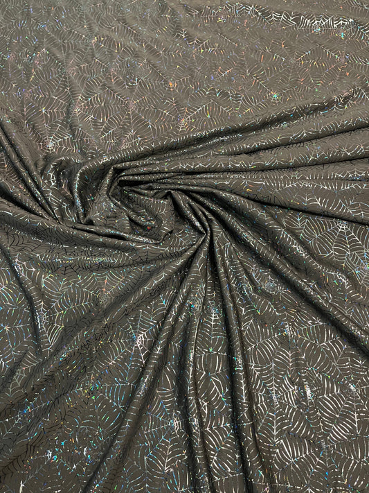 Spiderweb design black/black hologram nylon spandex 4-way stretch 58/60” Sold by the YD. Ships Worldwide from Los Angeles California USA.