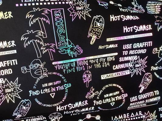 Graffiti paint design hiding zebra hologram spandex with foil print on best quality of nylon spandex 4-way stretch 58/60” sold by the YD.