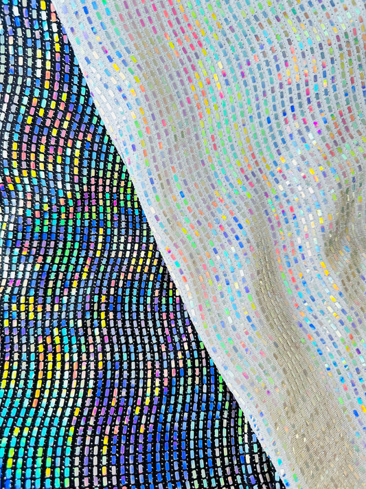 New zig zag hologram sequins design on stretch metallic spandex 2-way 58/60” Sold by the YD. Ships worldwide from Los Angeles California USA