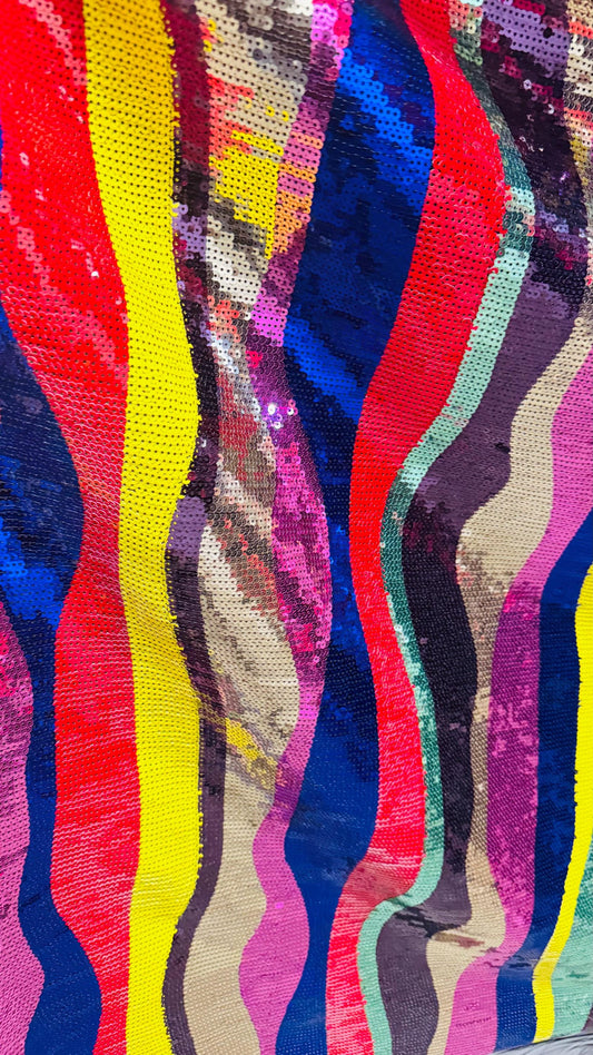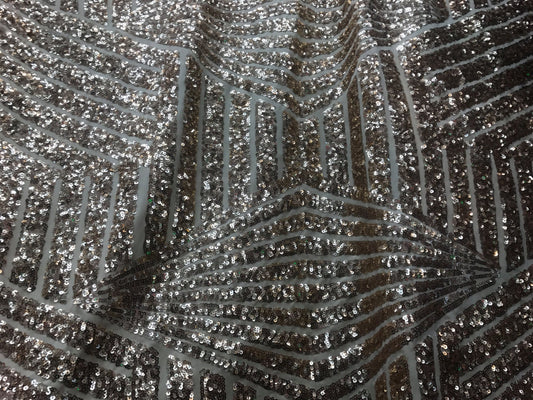 New modern wavy design trans sequins on 2-way stretch mesh 54/55” Sold by the YD. Ships worldwide from Los Angeles California USA.