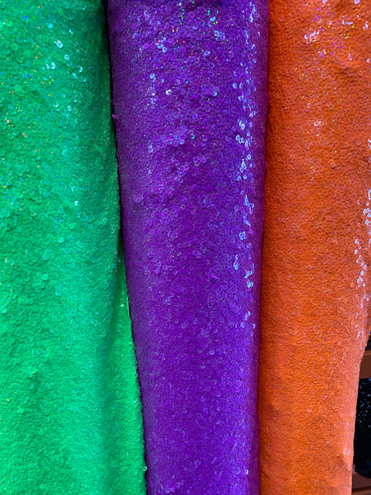 New overlapping sequins neon colors on spandex base 2-way stretch 58/60” Sold by the YD. Ships worldwide from Los Ángeles California USA.