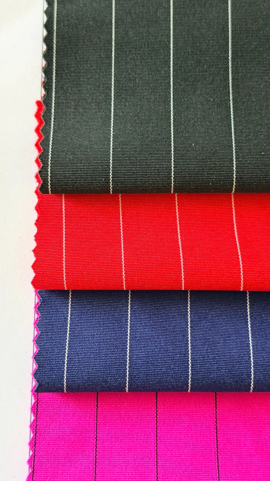 Pin stripes on nylon spandex 4-way stretch 58/60” Sold by the YD. Ships worldwide from Los Angeles California USA. High quality fabrics