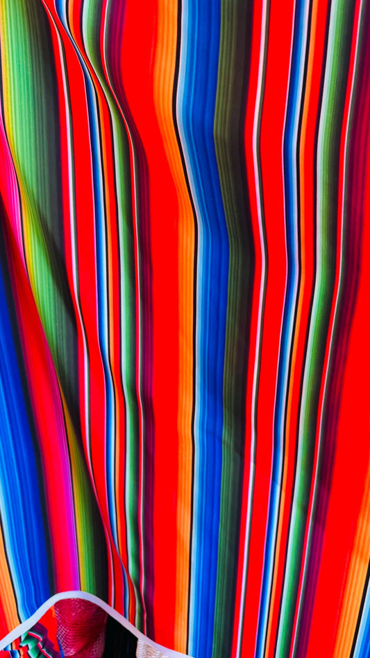 Zarape design colorful striped multicolor print on great quality of nylon spandex 4-way stretch 58/60” Sold by the YD.