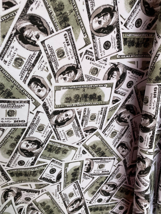 New money print design 100 dollars bill all over white/green print on nylon spandex 4-way stretch 58/60” Sold by the YD. Ships worldwide