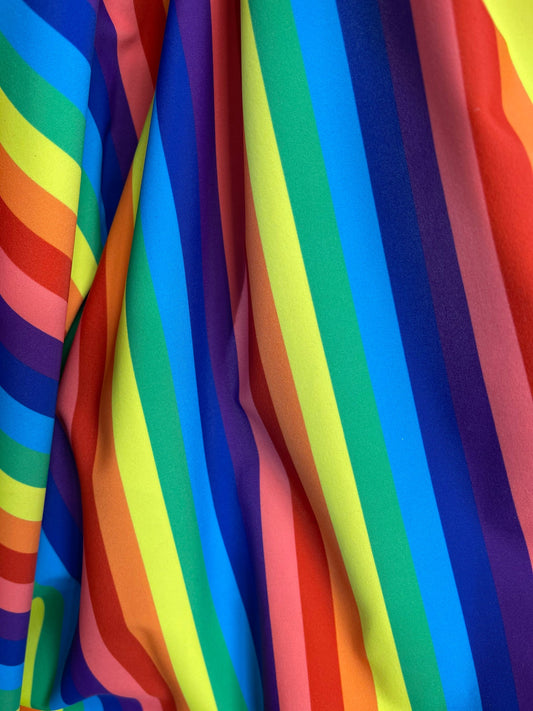 Rainbow stripes design print on best quality of nylon spandex 4-way stretch 58/60” Sold by the YD. Ships Worldwide from Los Ángeles cali USA
