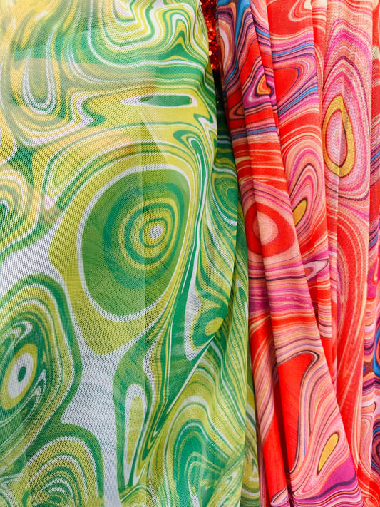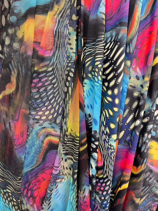 Lava abstract design print on great quality of nylon power mesh 4-way stretch 58/69” Sold by the YD.