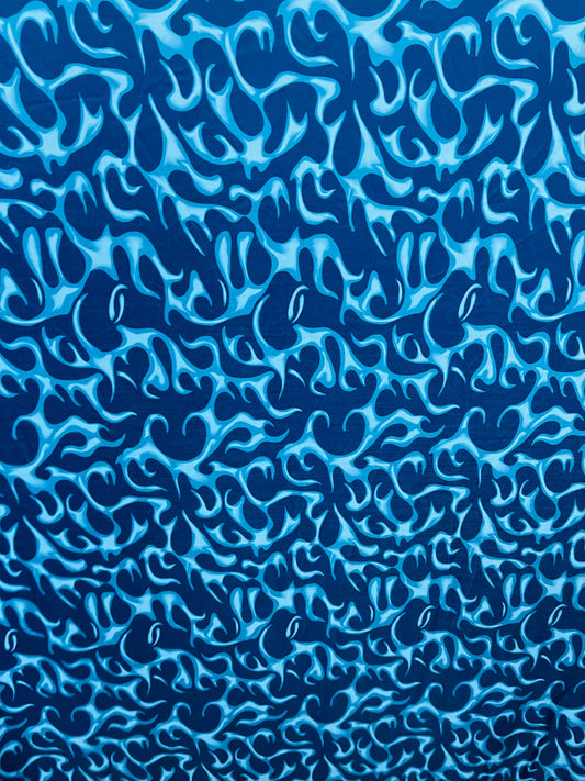 New Modern abstract flames design Blue color print on best quality of nylon spandex 4-way stretch 58/60” Sold by the YD. Ships Worldwide