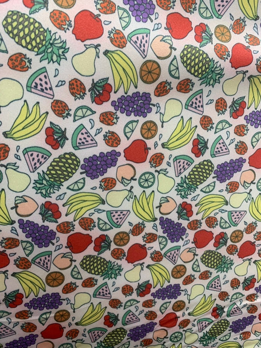 Multi fruits design print on nylon spandex 4way stretch 58/60" Sold by the YD. Ships worldwide from Los Ángeles California USA.