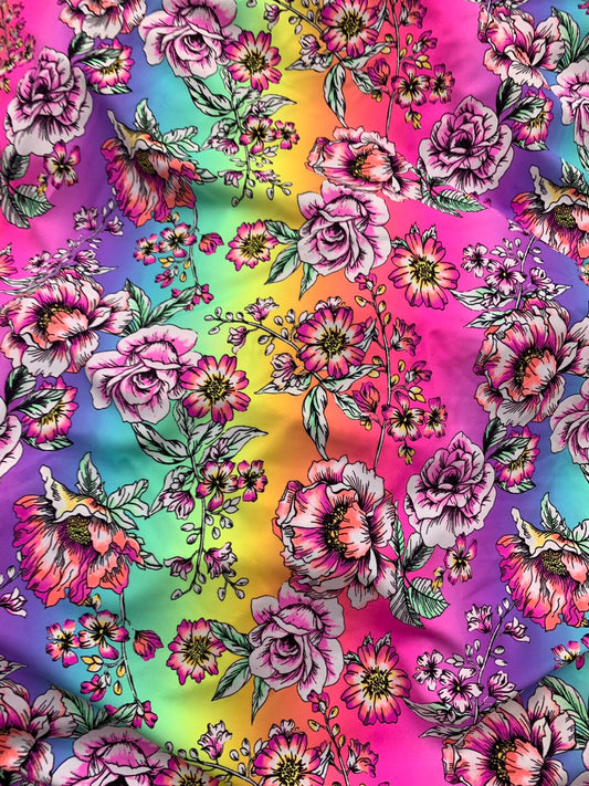 New flower design multicolor print on heavy nylon spandex 4way stretch 58/60" Sold by the YD. Ships worldwide from Los Angeles California.