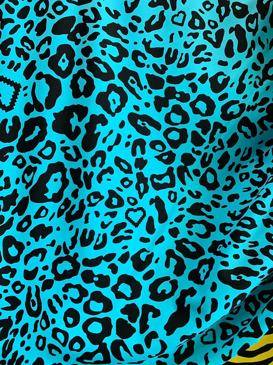 New leopard design blue/black nylon spandex 4way stretch 58/60" Sold by the YD. Ships worldwide from Los Angeles California USA.