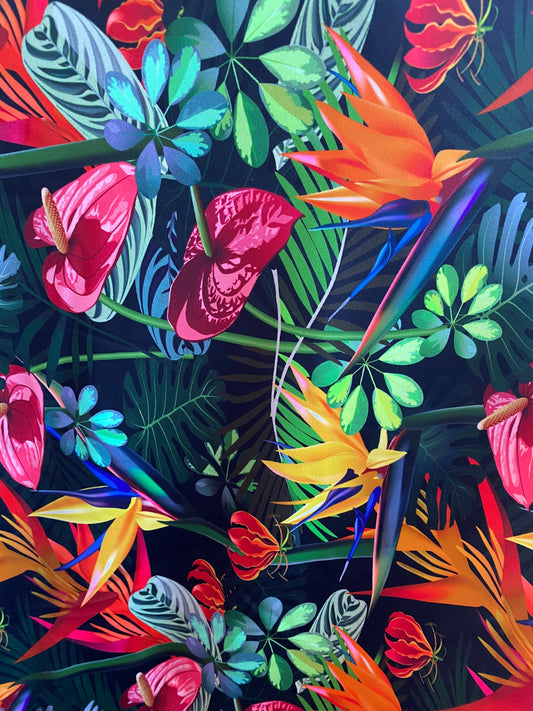 New paradise tropical design black multi great quality of nylon spandex 4-way stretch 58/60” Sold by the YD. Ships worldwide from Los CA USA