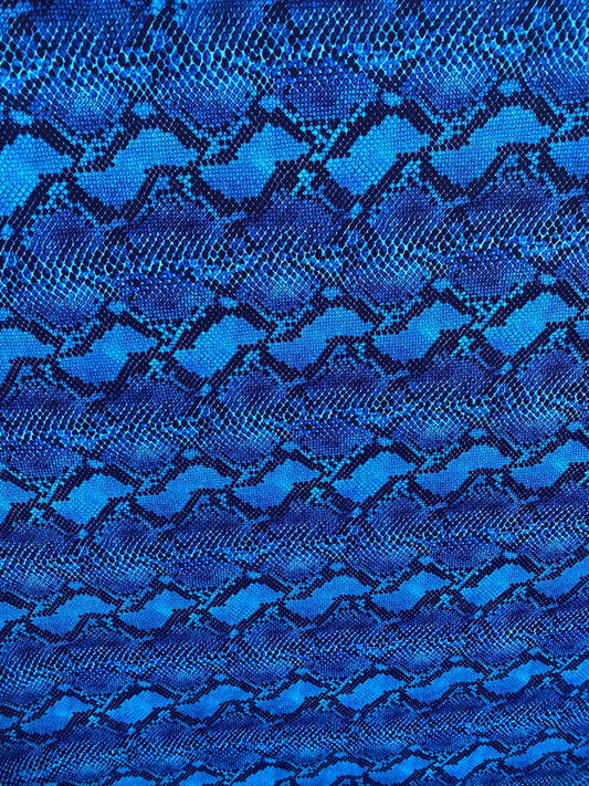 Serpent design Sapphire/Black print on nylon spandex 4-way stretch 58/60” Sold by the YD. Ships worldwide from Los Angeles California USA.