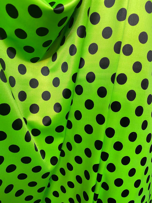 New polka dots design neon lime green with black dots nylon spandex 4-way stretch 58/60” Sold by the YD. Ships worldwide from Los Angeles CA