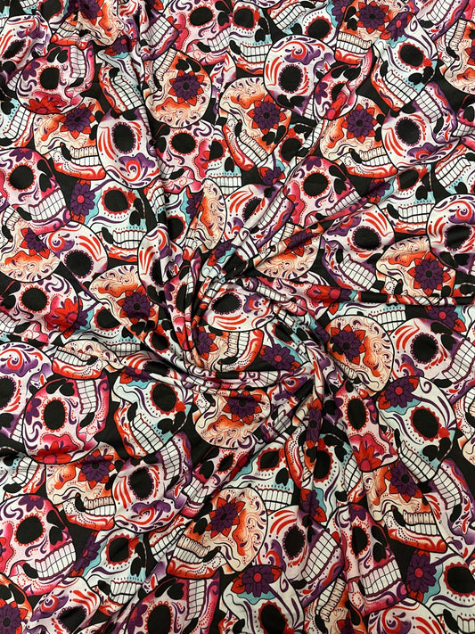 Skull design multicolor print on great quality of nylon spandex 4-way stretch 58/60” Sold by the YD. Ships Worldwide from Los Angeles cali
