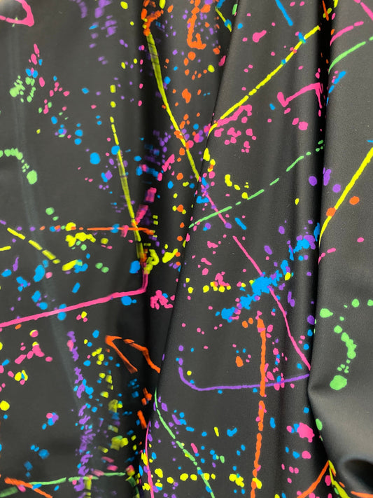 New Graffiti paint design black/multicolor nylon spandex 4-way stretch 58/60” Sold by the YD. Ships worldwide from Los Angeles California.