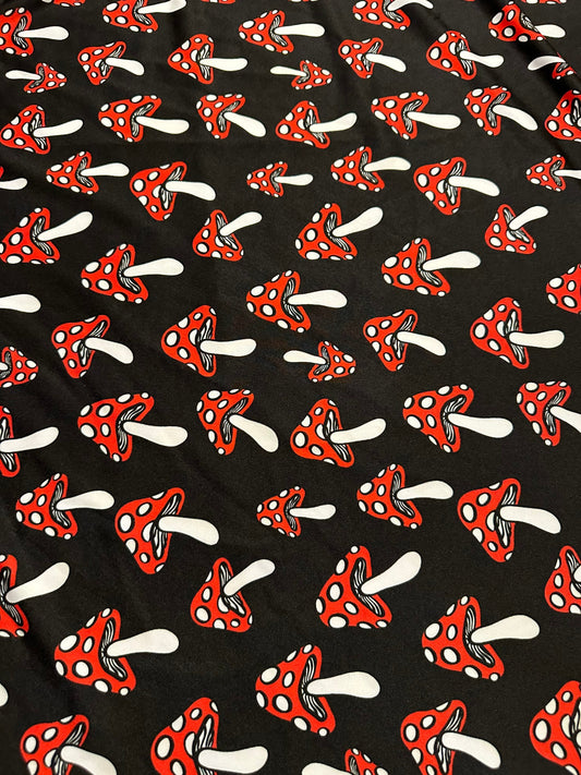 New Mushrooms designs Black/Red print on nylon spandex 4-way stretch 58/60” Sold by the YD. Ships worldwide from Los Angeles California USA