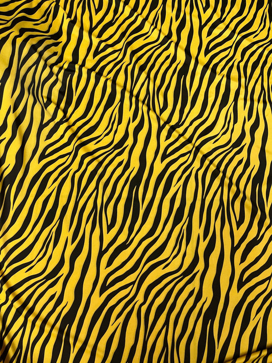 Exotic zebra design yellow/black print on nylon spandex 4-way stretch 58/60” Sold by the YD. Ships Worldwide from Los Angeles California USA