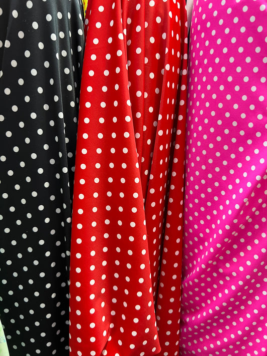 Small polka dots design print on best quality of nylon spandex 4-way stretch 58/60” Sold by the YD. Ships Worldwide from Los Ángeles CA