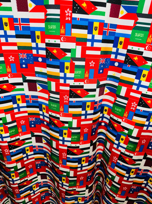 Nations flags design print on great quality of nylon spandex 4-way stretch 58/60” Sold by the YD.