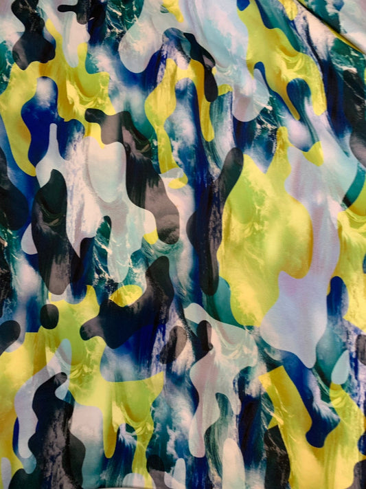 New camouflage multicolor design print on nylon spandex 4way stretch 58/60" Sold by the YD. Ships worldwide from Los Angeles California USA.