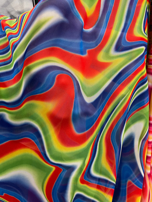 New Modern abstract lava design multicolor print on best quality of power mesh spandex 4-way stretch 58/60” Sold by the YD. Ships Worldwide