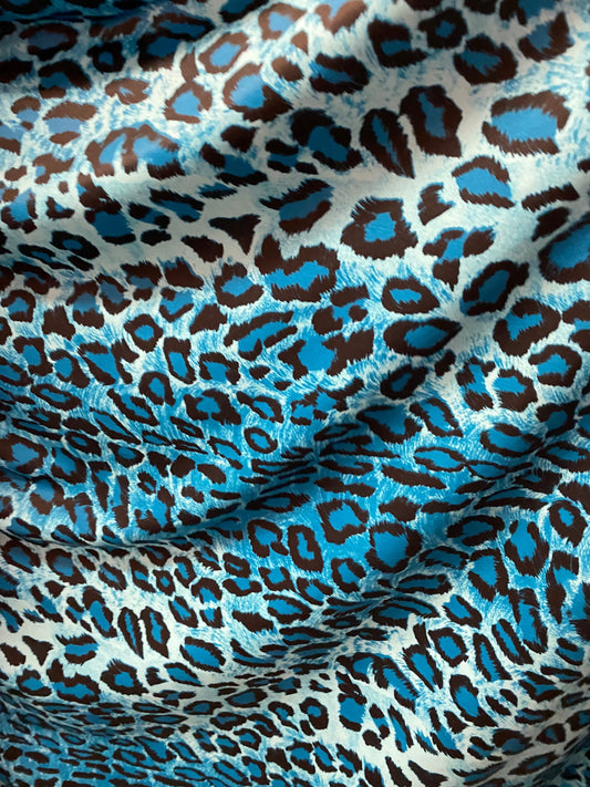 Exotic leopard design Teal/Blue/black print on nylon spandex 4-way stretch 58/60” Sold by the YD. Ships worldwide from Los Angeles Californi