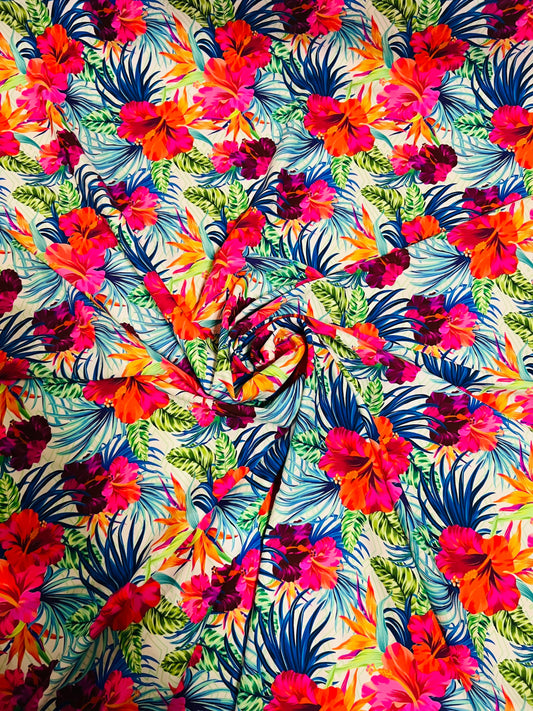 Romantic Hawaiian design white/multicolor print on best quality of nylon spandex 4-way stretch 58/60”