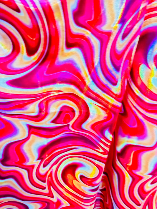 New Modern abstract lava design on Iridescent metallic nylon spandex 4-way stretch 58/60” Sold by the YD.
